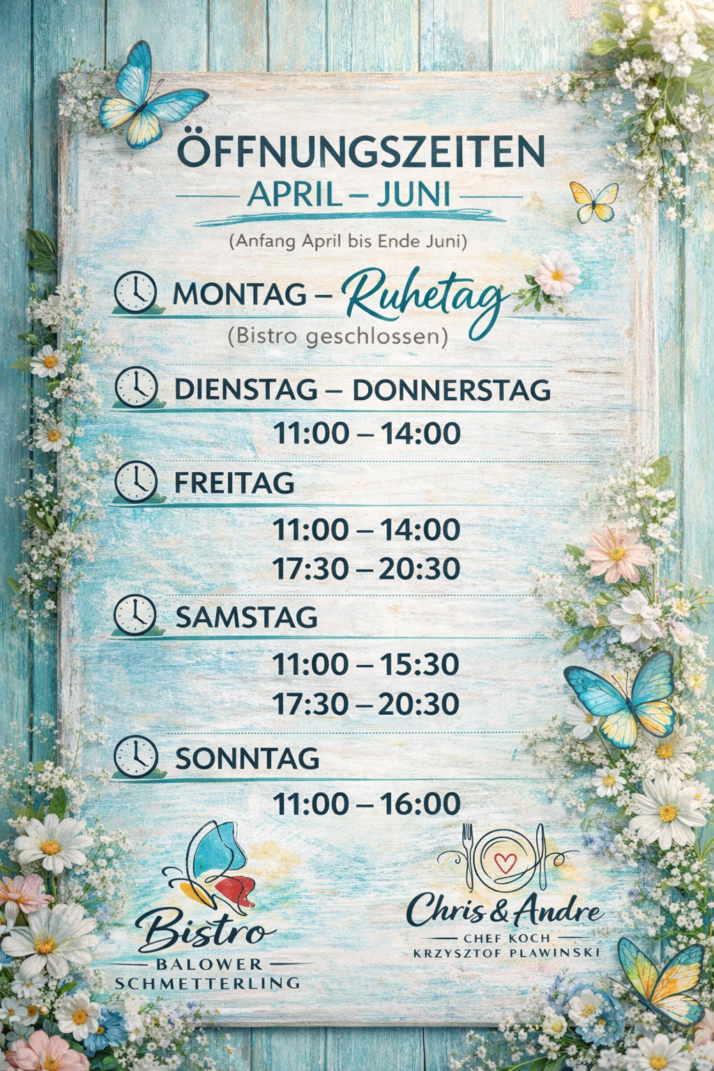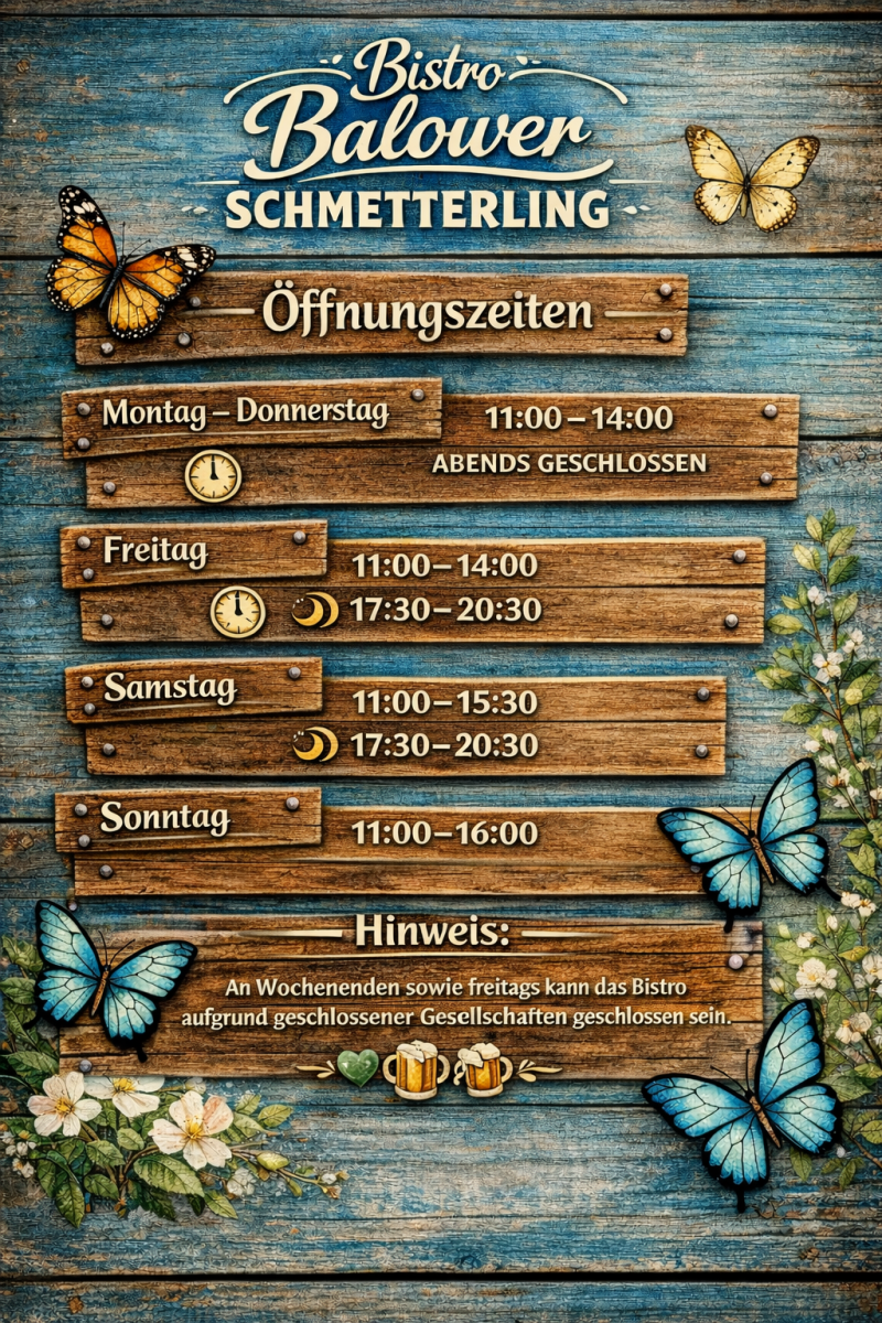 Das Bistro Balower Schmetterling ist ein Ort, an dem Qualität, Gastfreundschaft und Liebe zum Detail im Mittelpunkt stehen. Wir legen großen Wert auf hausgemachte Speisen und eine herzliche Atmosphäre.